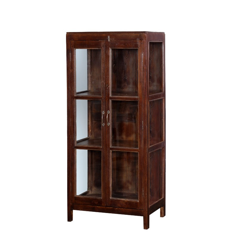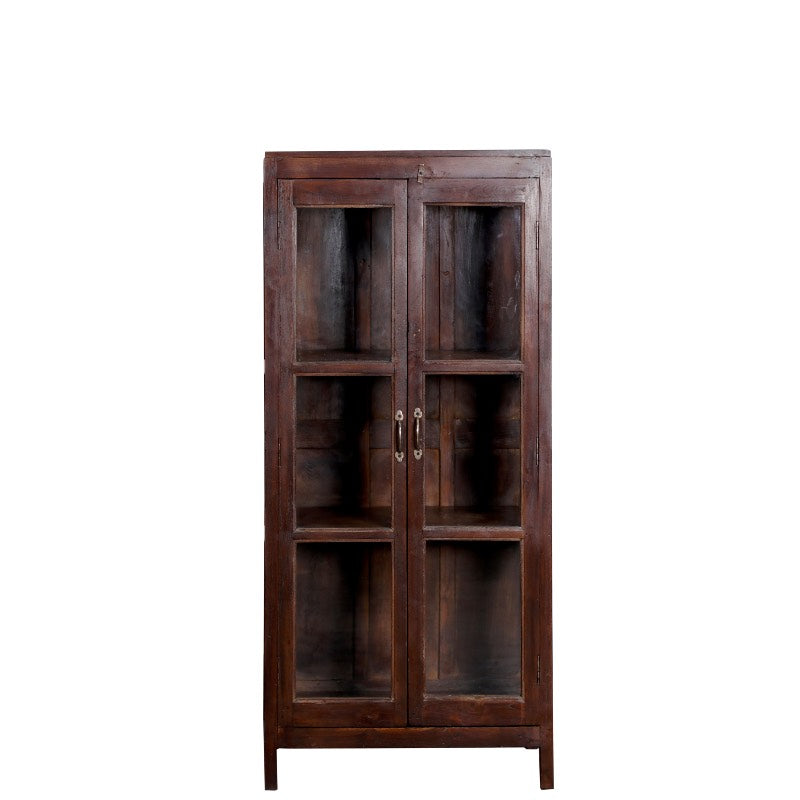 This fine display cabinet with glass doors is an old, unique cabinet that has been restored and painted black on the outside and white on the inside, which makes the cabinet brighter and that the things you store in the cabinet are more visible. The cupboard has four shelves, if you count the bottom, and is designed for storing glass, porcelain or books and magazines.