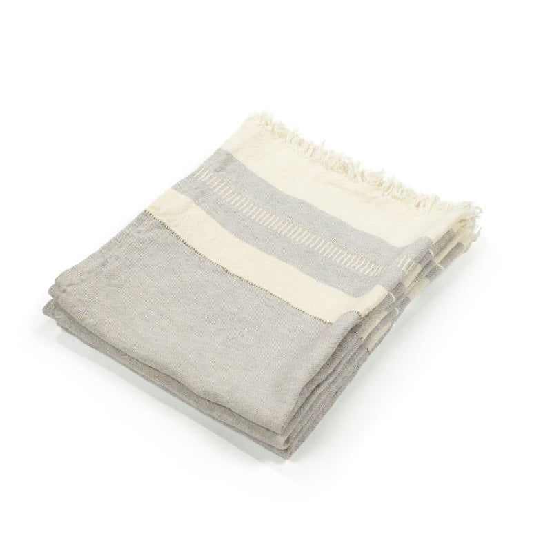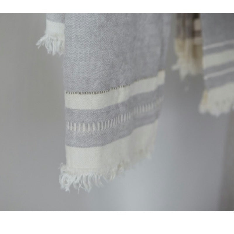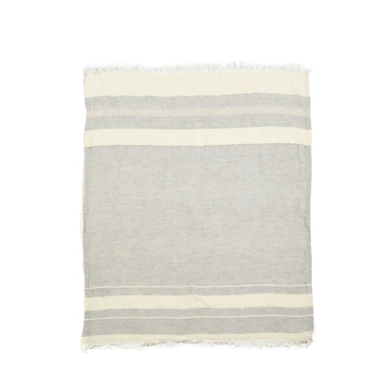 Lækker gæstehåndklæde i 100% hør og en skøn afdæmpet grå farve, med hvide striber og frynser i begge ender. Brug dem som små gæstehåndklæder på gæstetoilettet eller som et lille køkken håndklæde.