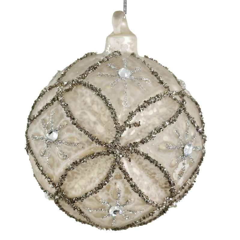 Glaskugle antik look i mat perlemor med sølv glitter 8 cm. til at hænge i juletræet eller som dekoration i lanterne eller på et fad.