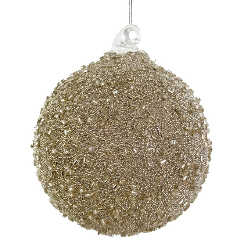 Glaskugle fuldt indsvøbt med små glasperler i sølv 8cm til juletræet eller som pynt i lanterne eller på et fad.
