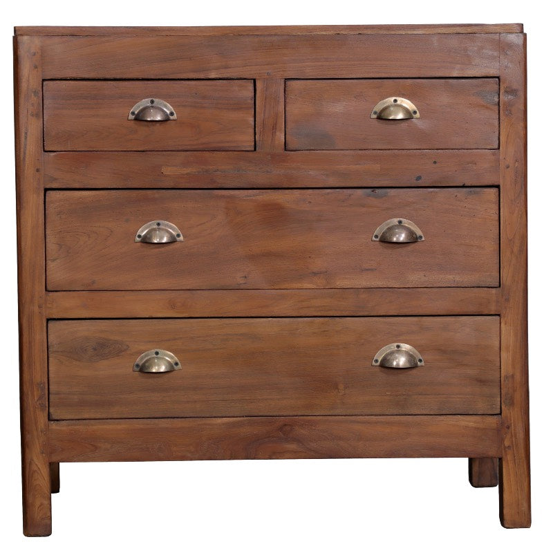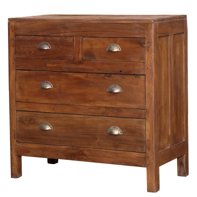 Skøn unika kommode i naturfarvet mørk træ, med fire skuffer med rustikke greb. Super i entreen, sove- eller badeværelset.