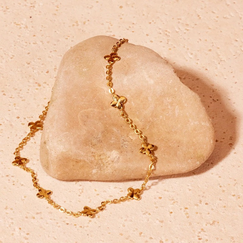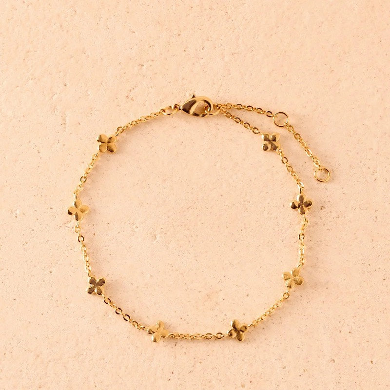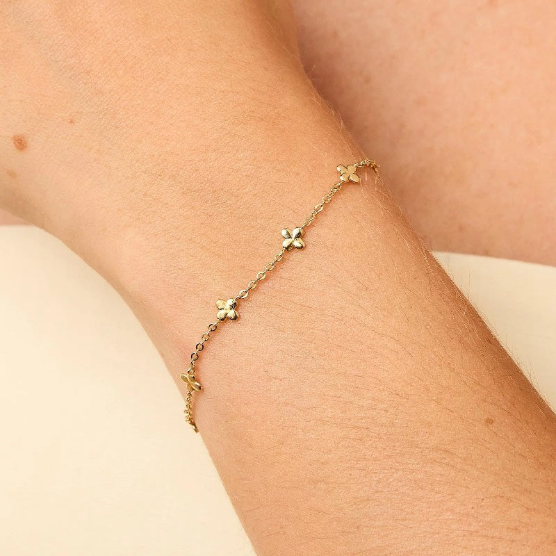 Små firkløverblade på en fin armbåndskæde. Firkløverne er afrundede og har et lidt blødt udtryk