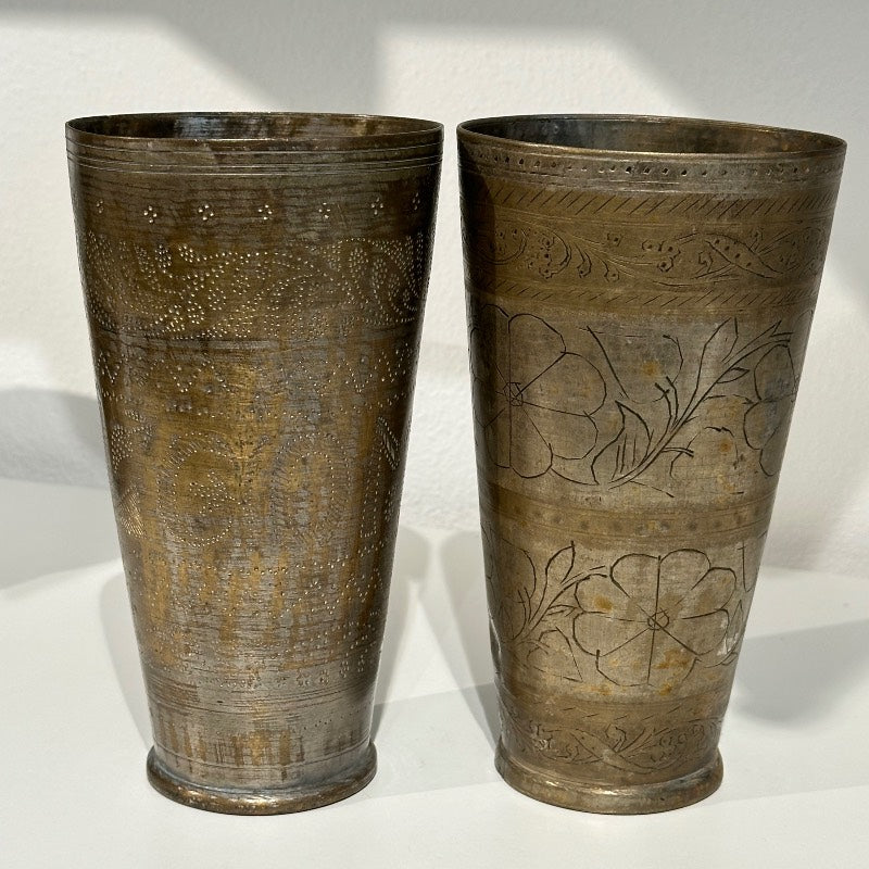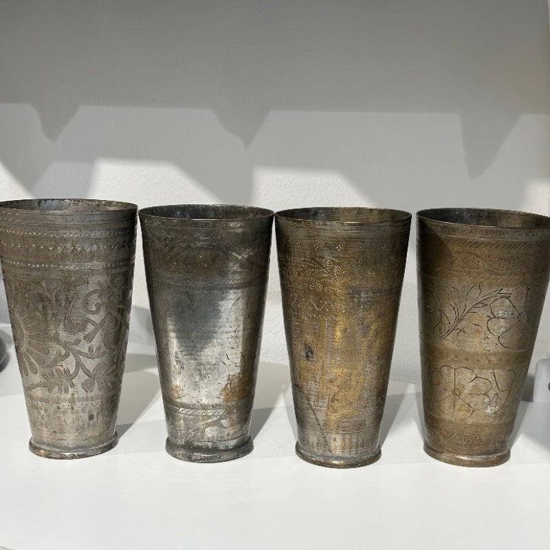 Vores Lassibægere er små unikke perler, der alle er omkring 70 år gamle. Oprindeligt blev de brugt til at drikke Lassi af, der er den indiske form for yoghurt af - og givet som dåbsglas, med et personligt indgraveret mønster. Vi bruger dem til alt fra blomster, pensler, tandbørster eller krydderurter - og blander gerne flere forskellige størrelser sammen