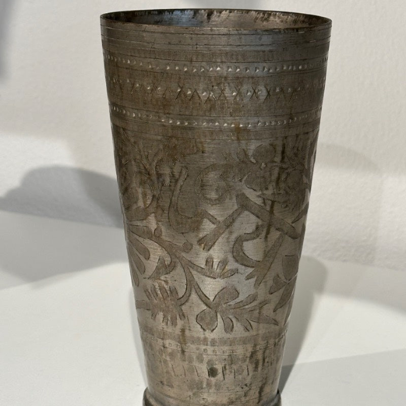 Vores Lassibægere er små unikke perler, der alle er omkring 70 år gamle. Oprindeligt blev de brugt til at drikke Lassi af, der er den indiske form for yoghurt af - og givet som dåbsglas, med et personligt indgraveret mønster. Vi bruger dem til alt fra blomster, pensler, tandbørster eller krydderurter - og blander gerne flere forskellige størrelser sammen