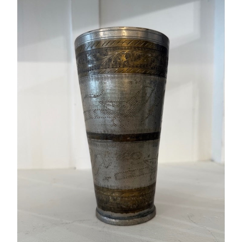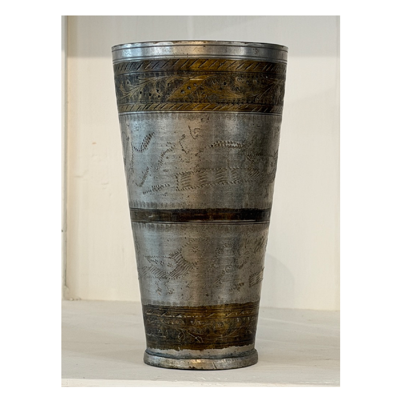 Vores Lassi-bægere er små unikke perler, der alle er omkring 70 år gamle. Oprindeligt blev de brugt til at drikke Lassi af, der er den indiske form for yoghurt - og givet som dåbsglas, med et personligt indgraveret mønster. Vi bruger dem til alt fra blomster, pensler, tandbørster eller krydderurter - og blander gerne flere forskellige størrelser sammen