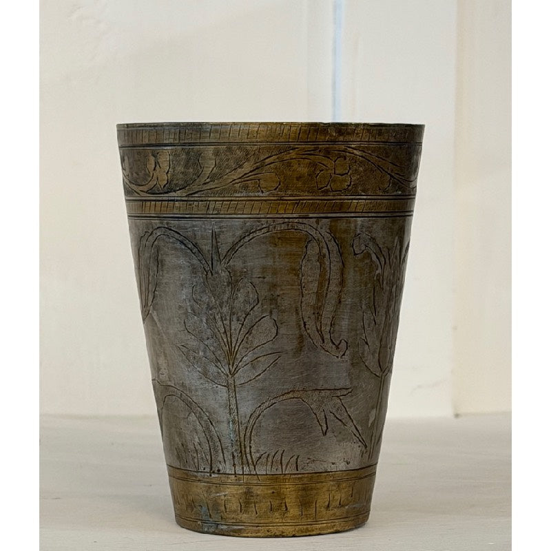 Vores Lassi-bægere er små unikke perler, der alle er omkring 70 år gamle. Oprindeligt blev de brugt til at drikke Lassi af, der er den indiske form for yoghurt - og givet som dåbsglas, med et personligt indgraveret mønster. Vi bruger dem til alt fra blomster, pensler, tandbørster eller krydderurter - og blander gerne flere forskellige størrelser sammen