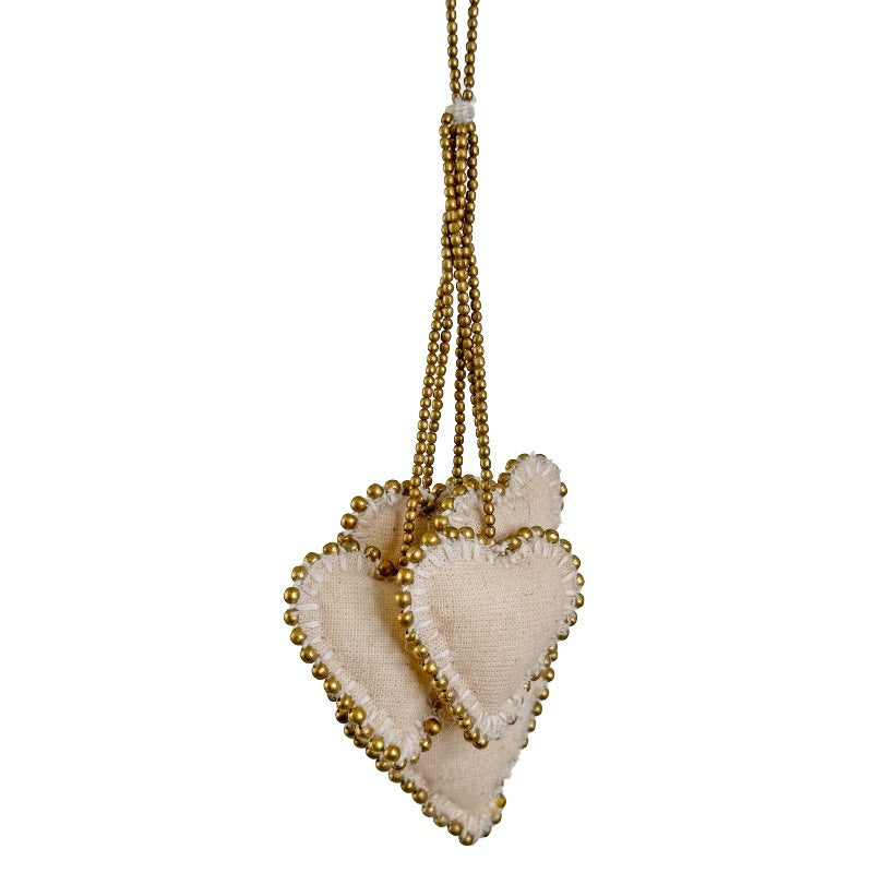 Muslin hjertesæt á 5 stk. med perler i messinglook til ophæng i juletræ eller vindue.