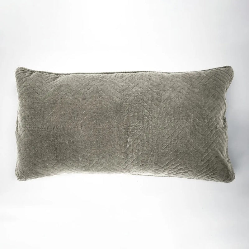 Smukt pudebetræk i fin grå velour med quiltet mønster. Bagpå har betrækket sløjfelukning og bagside er syet i en lys grå bomuld.